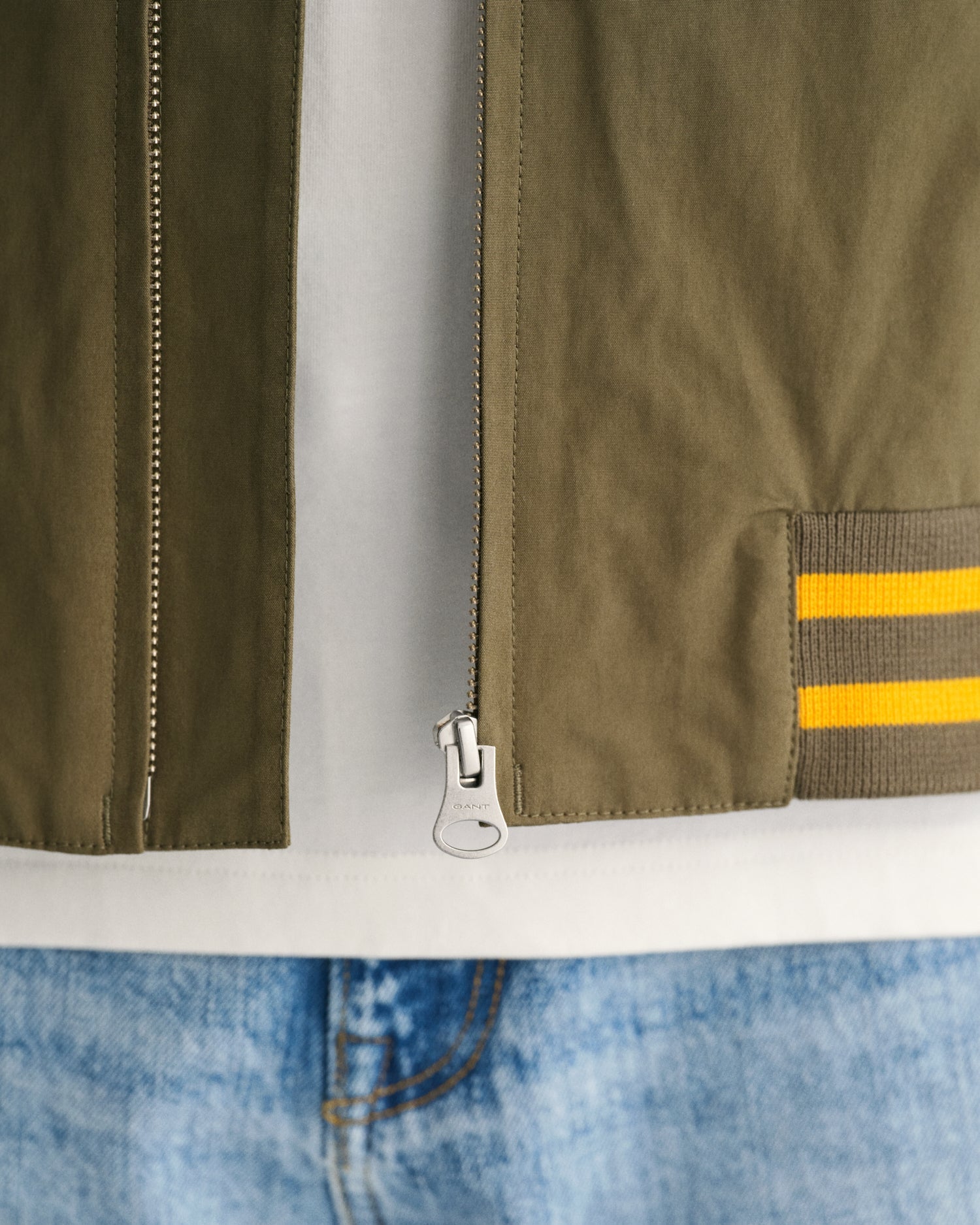 Inspired by vintage letterman jackets, this varsity jacket is where modern collegiate meets nostalgia. Crafted in lightweight cotton with a water-repellent finish, this jacket's retro features include a bomber collar, striped ribbed detailing, sleeve panels in a contrast color, and a G terry badge applied at the chest. Cut for a regular fit that sits just above the hips, this jacket is fully lined with a front zip closure, slanted welt side pockets and two additional interior welt pockets to provide plenty of practicality.