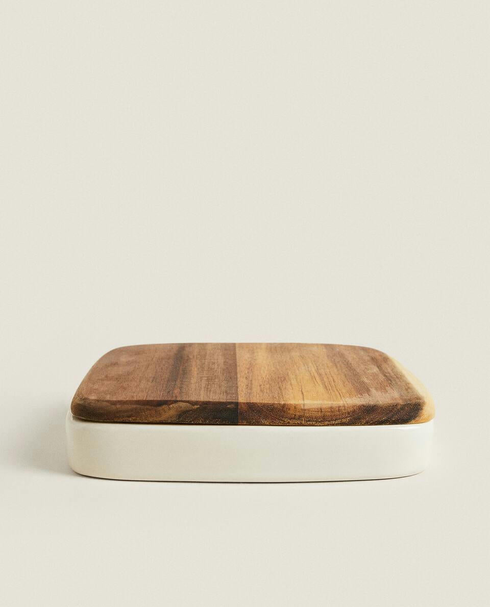 The set comes in a stoneware container with a sliding acacia wood lid.