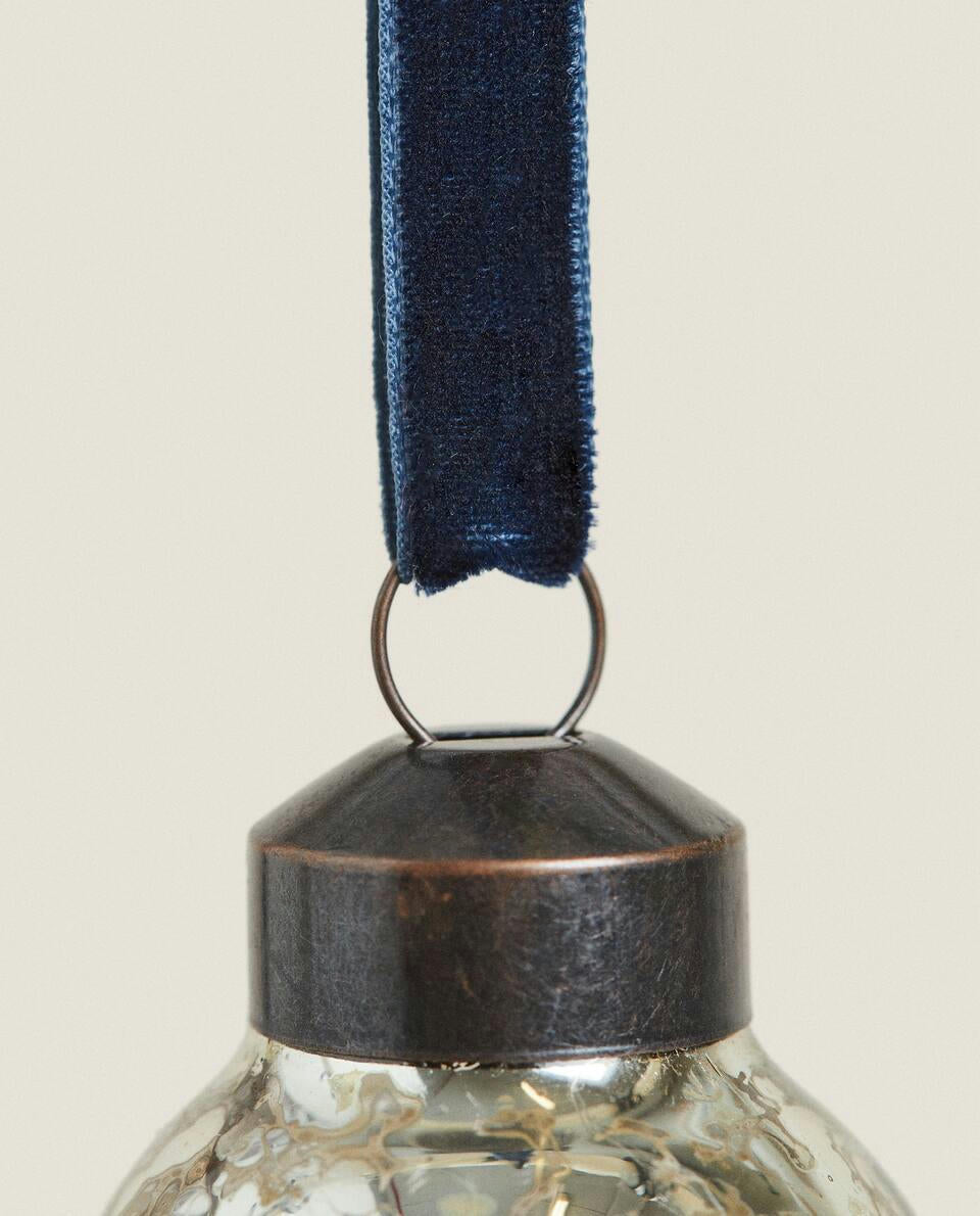 Mercurised glass Christmas tree decoration in the shape of an oval with a shiny effect and a velvet ribbon for hanging.