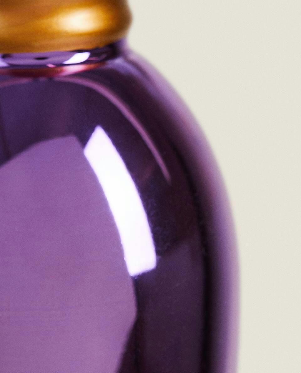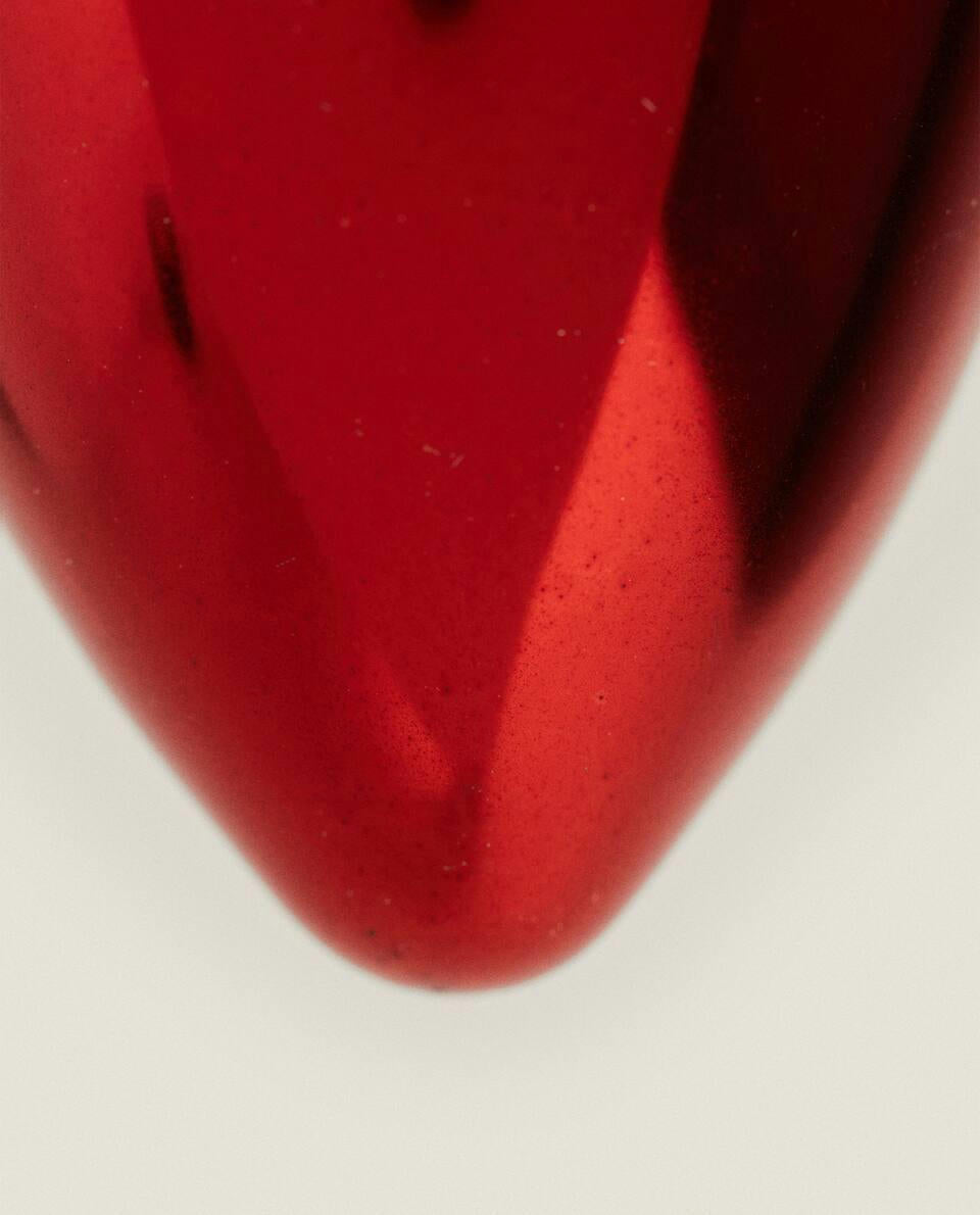 Glass Christmas tree light bulb decoration with a shiny effect and a velvet ribbon for hanging.