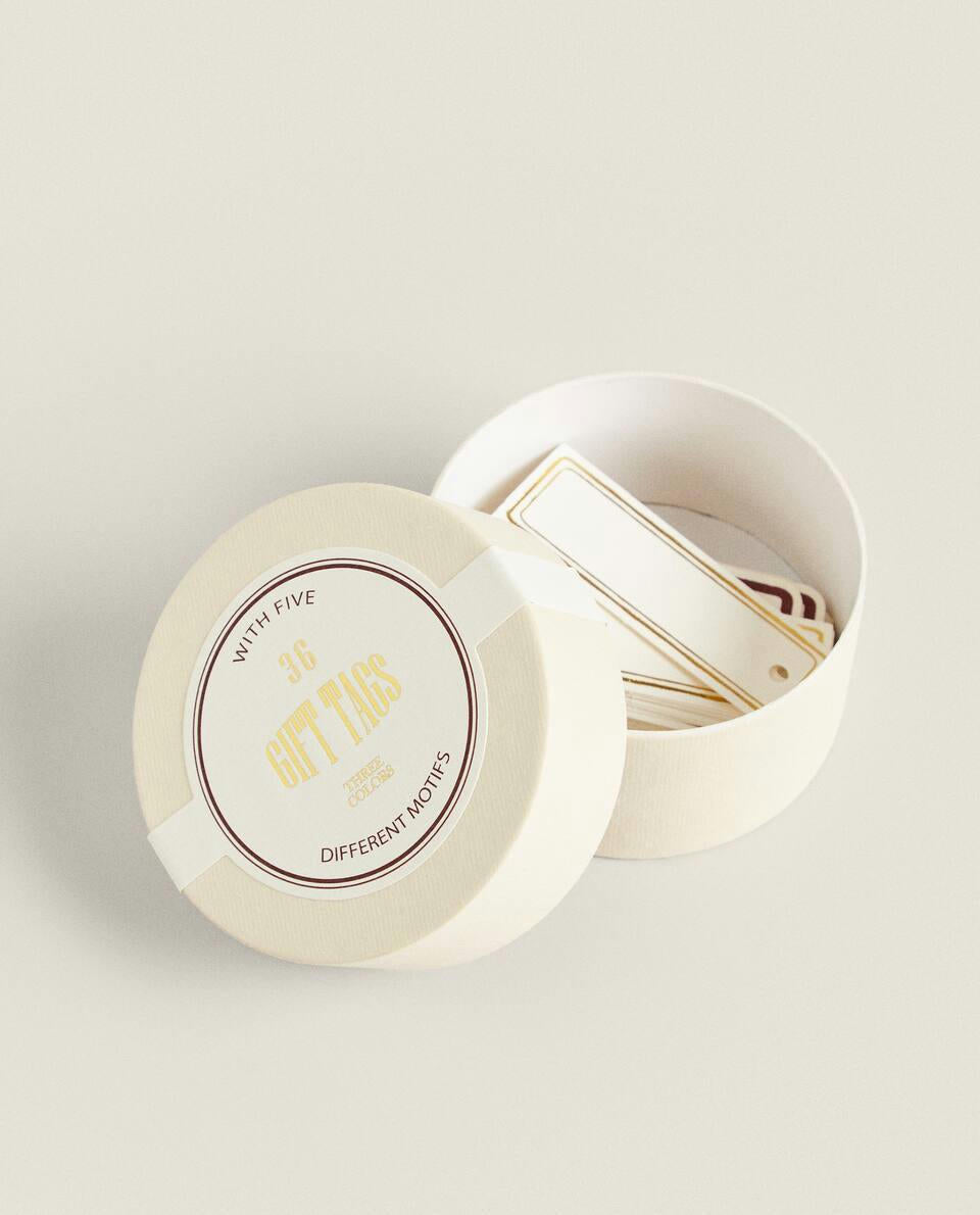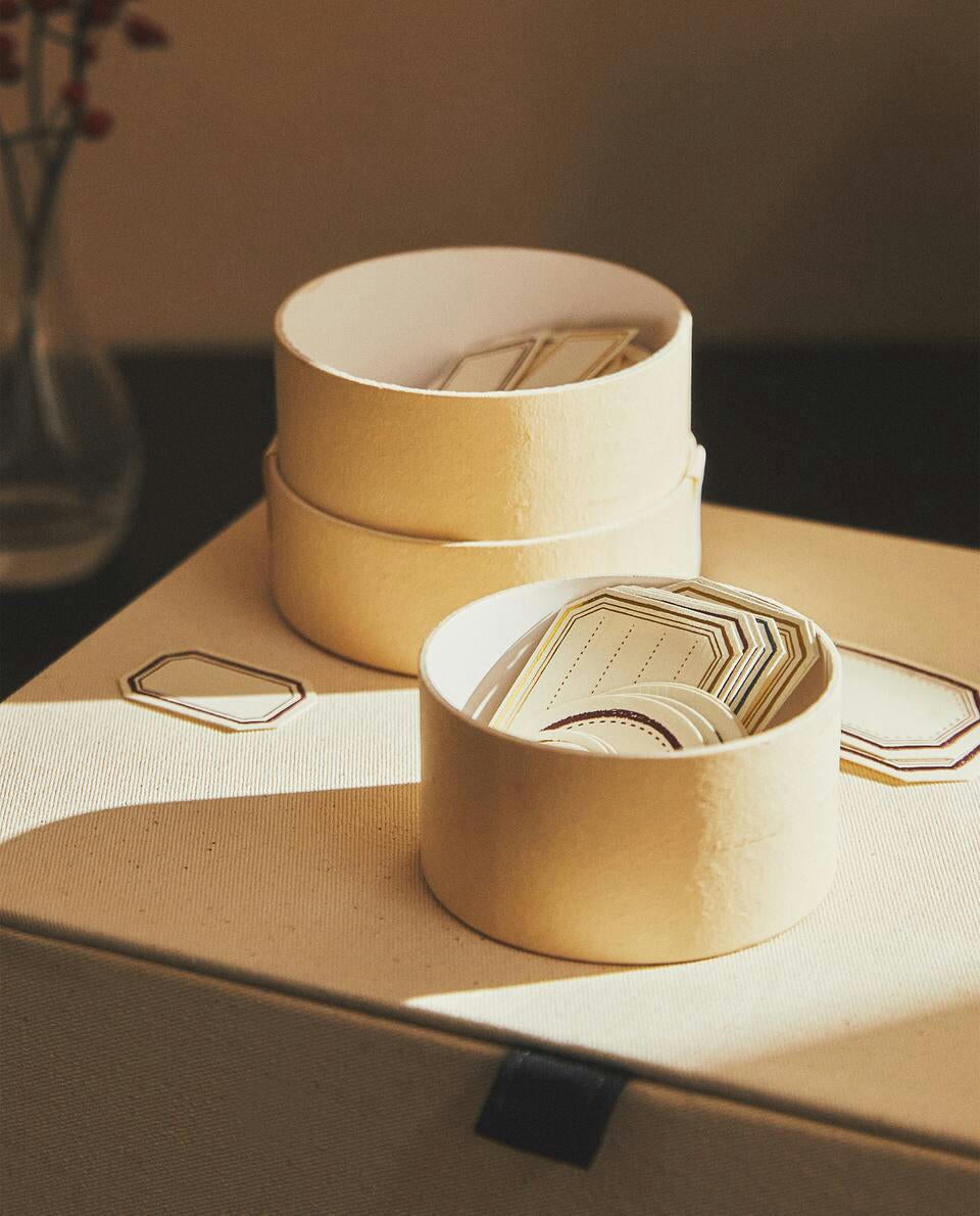 Round box with a lid, featuring paper labels for Christmas gifts.