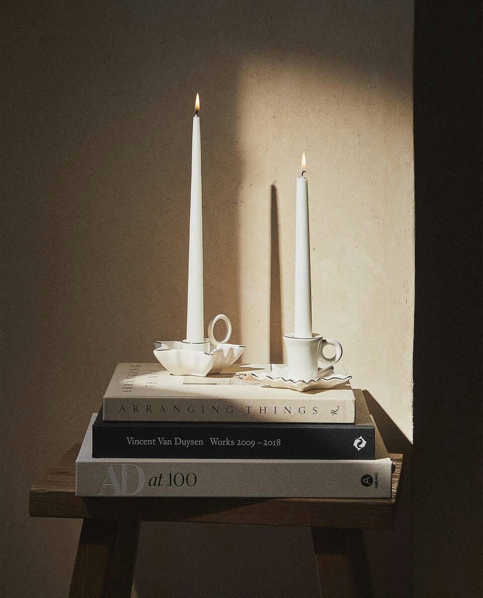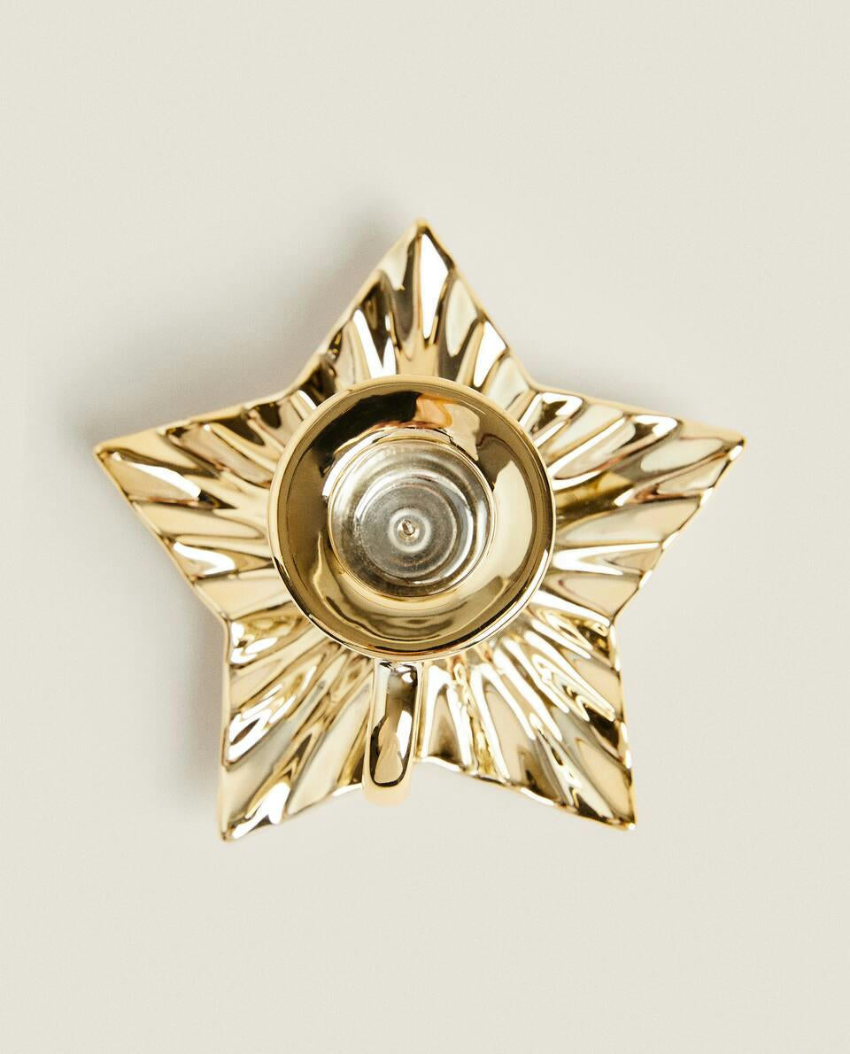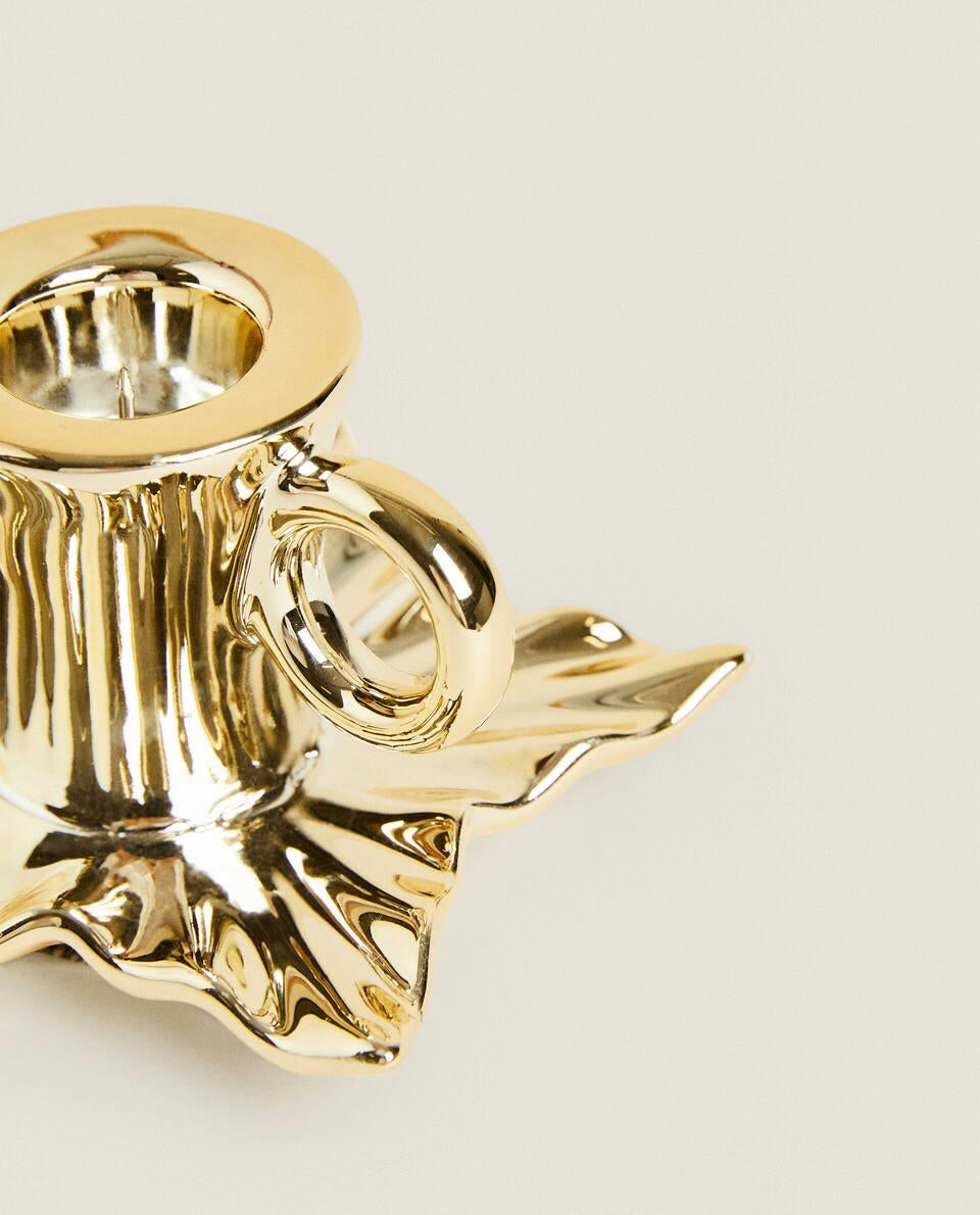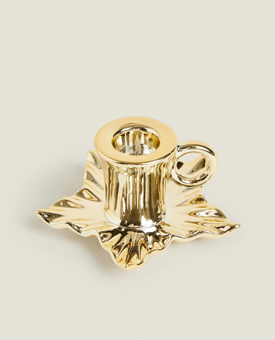 Porcelain candlestick with handle, featuring a leaf-shaped base with a gold rim, for Christmas.