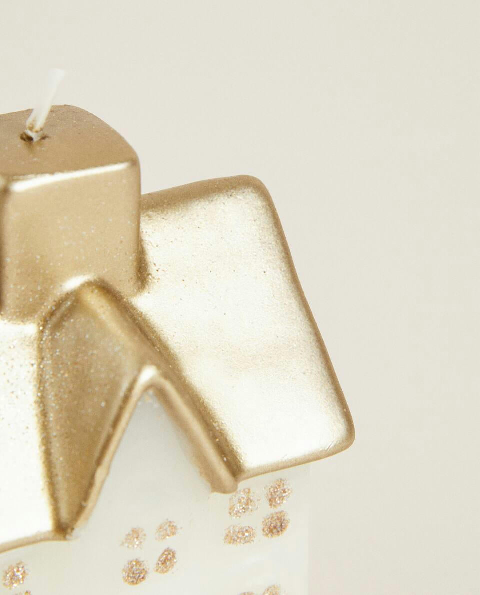 House-shaped decorative candle with glitter, for Christmas.