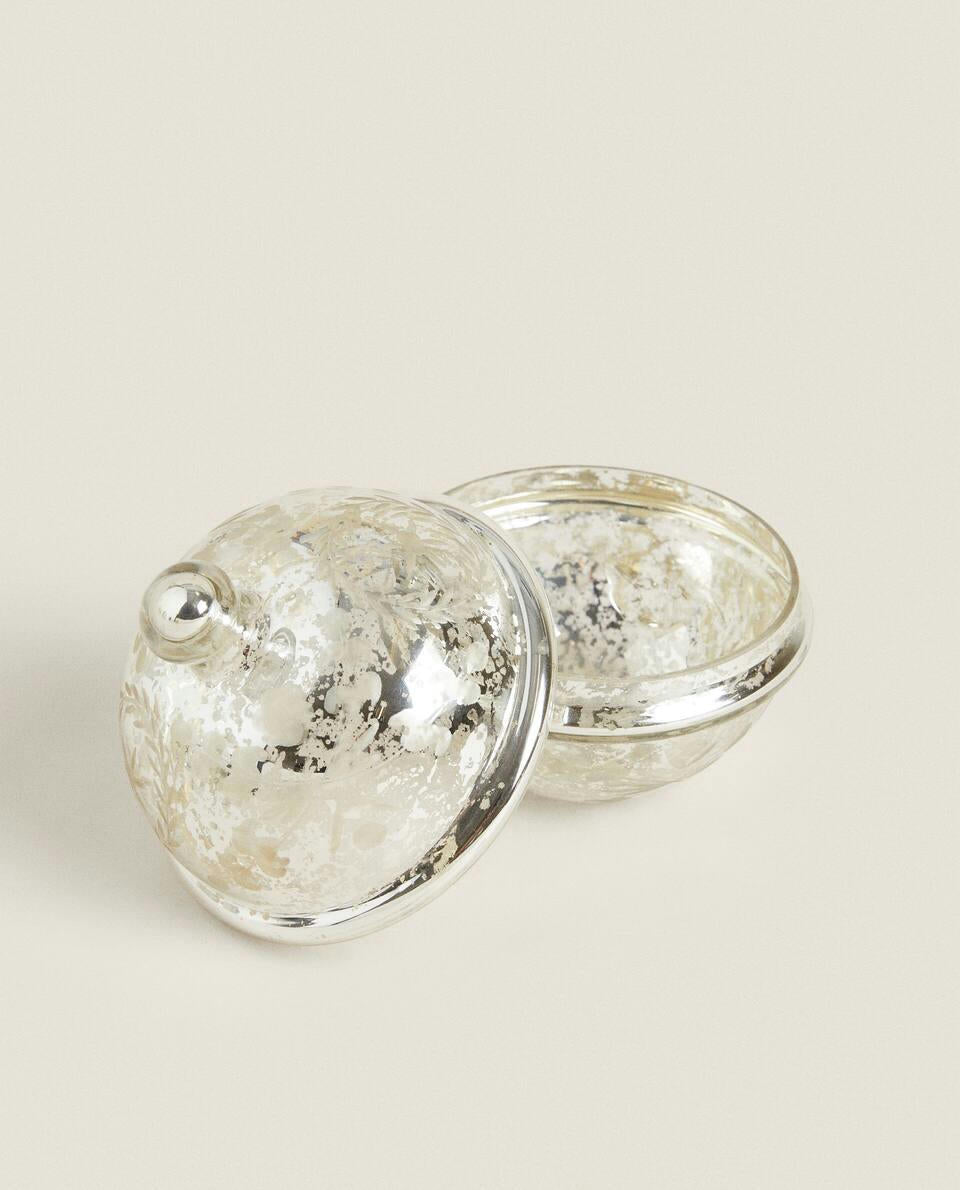 Spherical mercurised glass box with a lid, for Christmas.