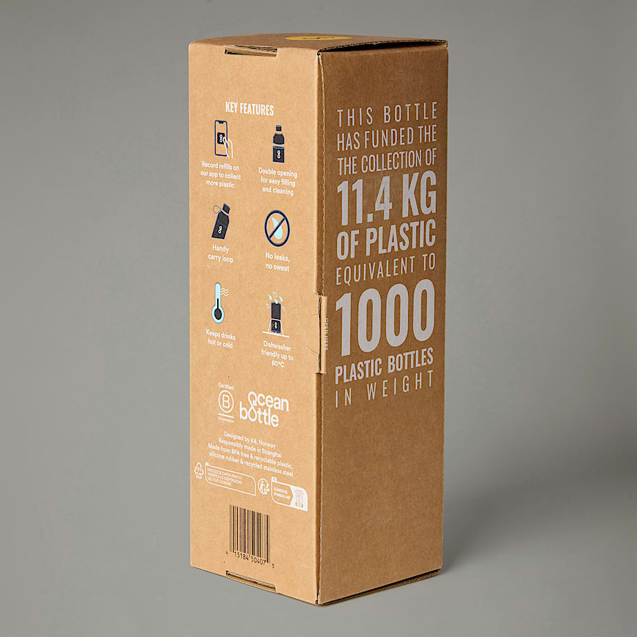 - Made from double-wall, vacuum-insulated stainless steel that's ultra-tough, the 0.9-litre X Ocean Bottle water bottle is cleverly designed to keep your cold drinks cold and hot drinks hot. It has a dual opening for ice and easy cleaning, it won't leak or sweat in your hiking backpack, and it's 100% dishwasher safe. It's made from a mix of recycled materials and ocean-bound plastic, too, helping to keep our oceans safe. The reusable water bottle is created in partnership with Ocean Bottle. With the sale of every Ocean Bottle, we prevent the equivalent of 1,000 plastic bottles from reaching the ocean. The bottle includes an embedded NFC base plate in the base of the bottle, which can be scanned to allow individuals to track their refills and plastic collection contribution through the Ocean Bottle app.